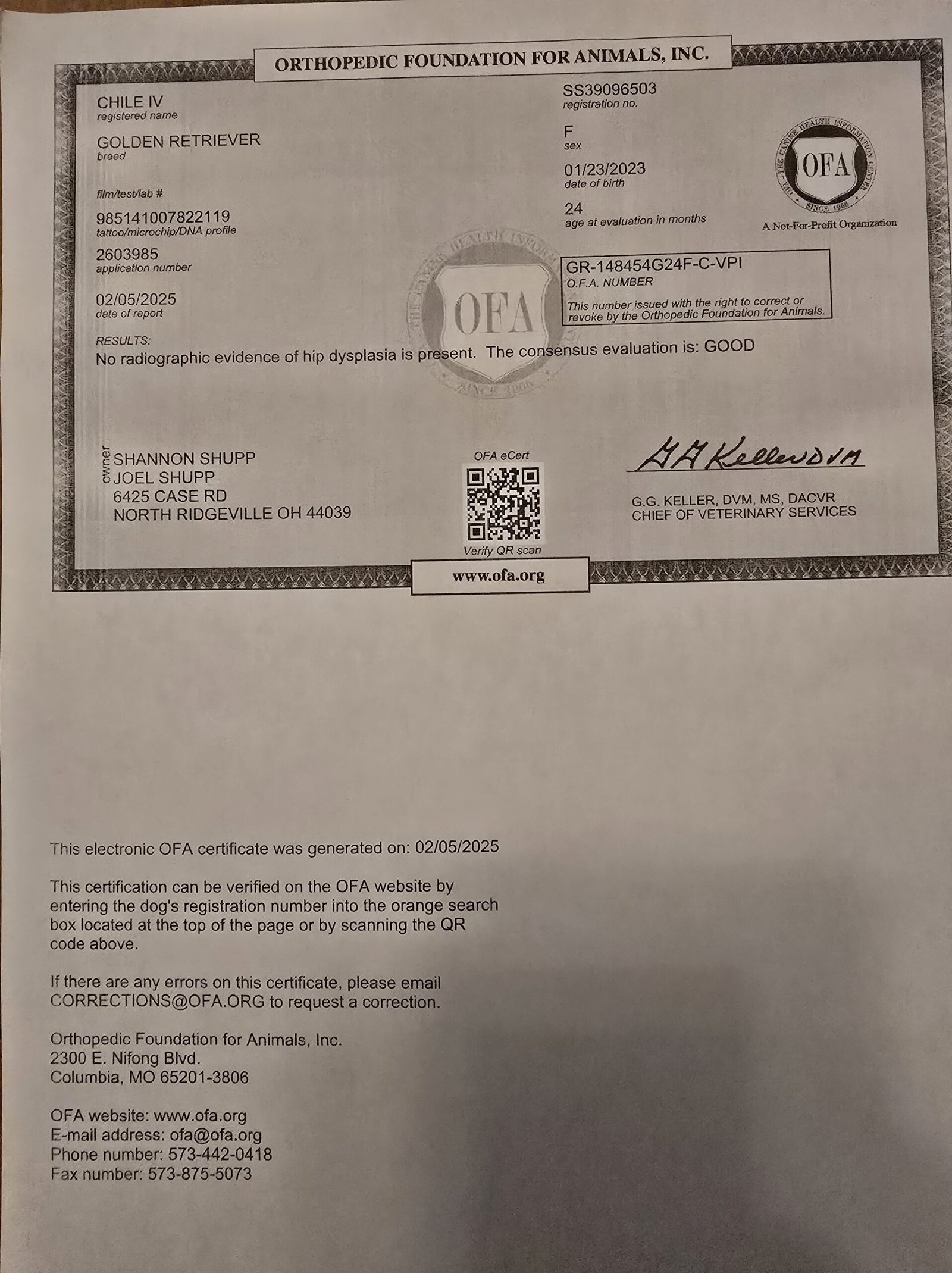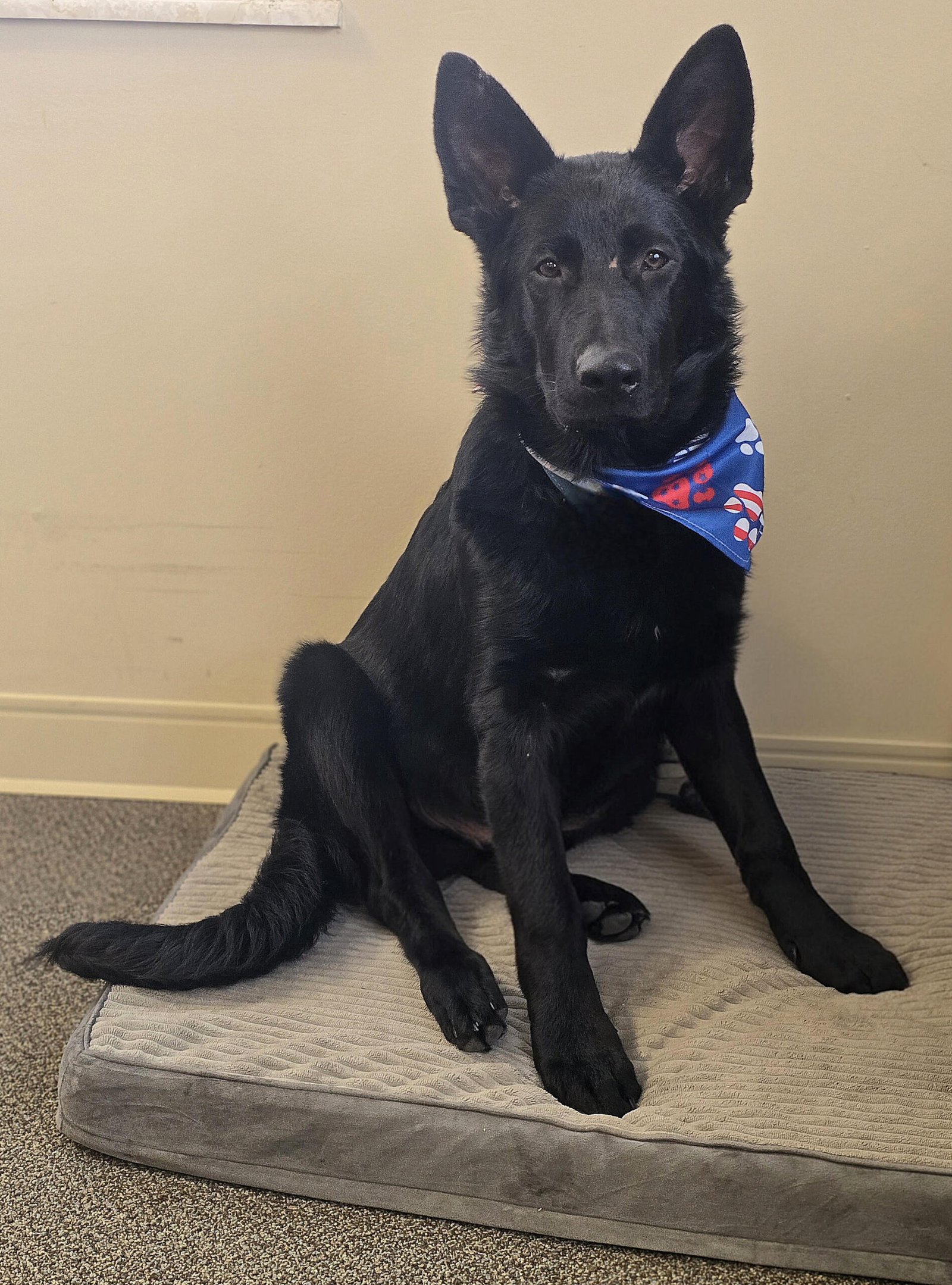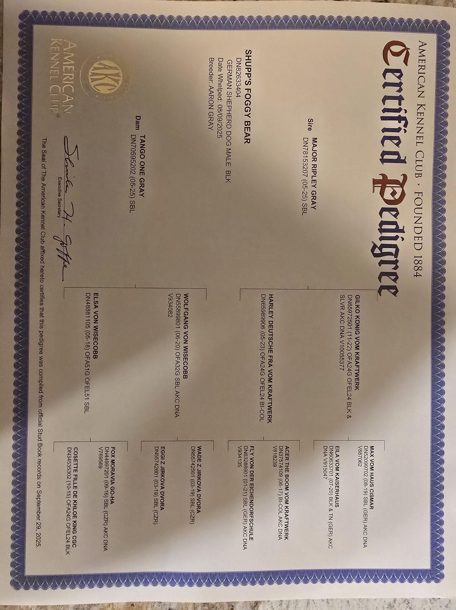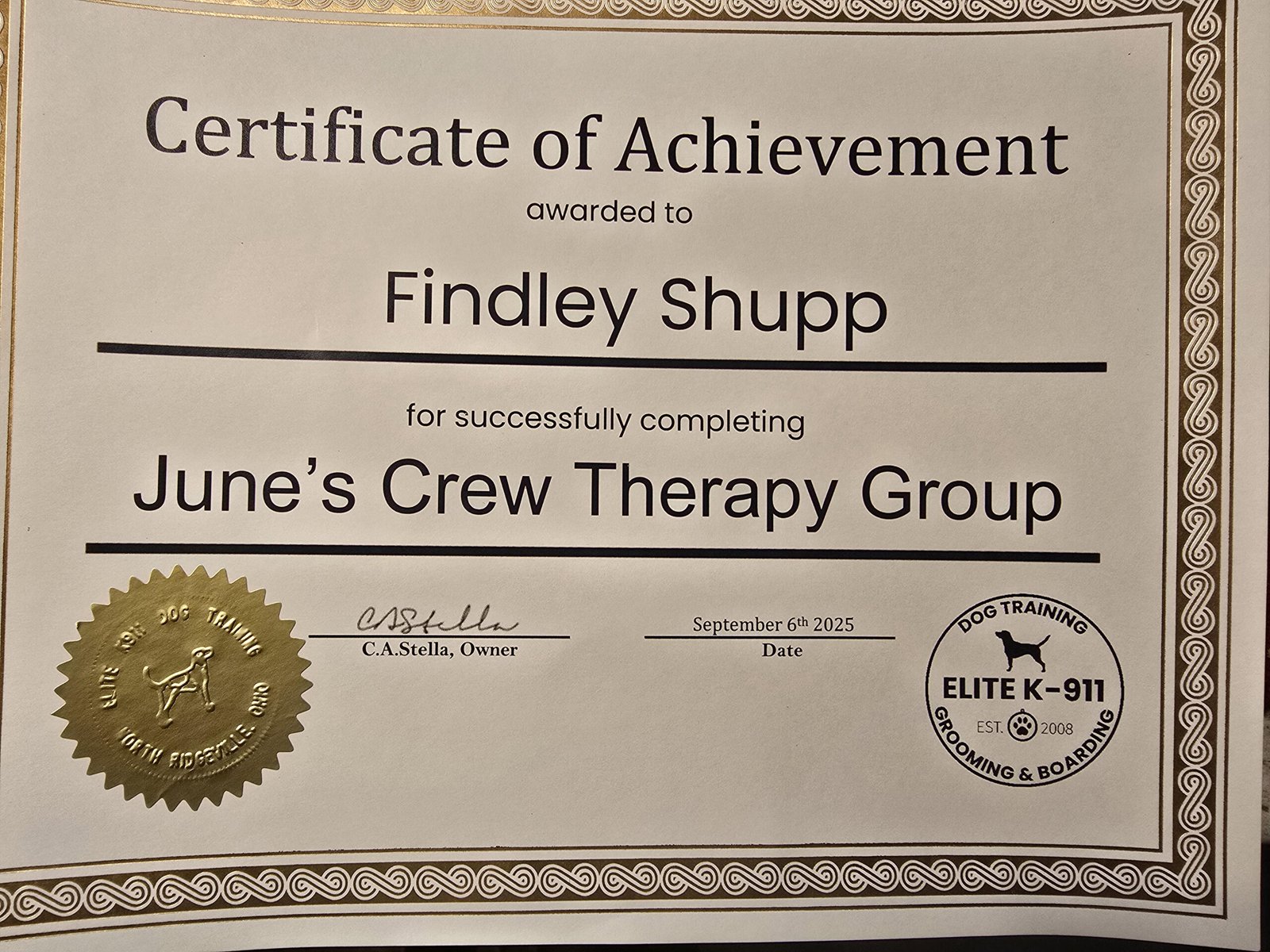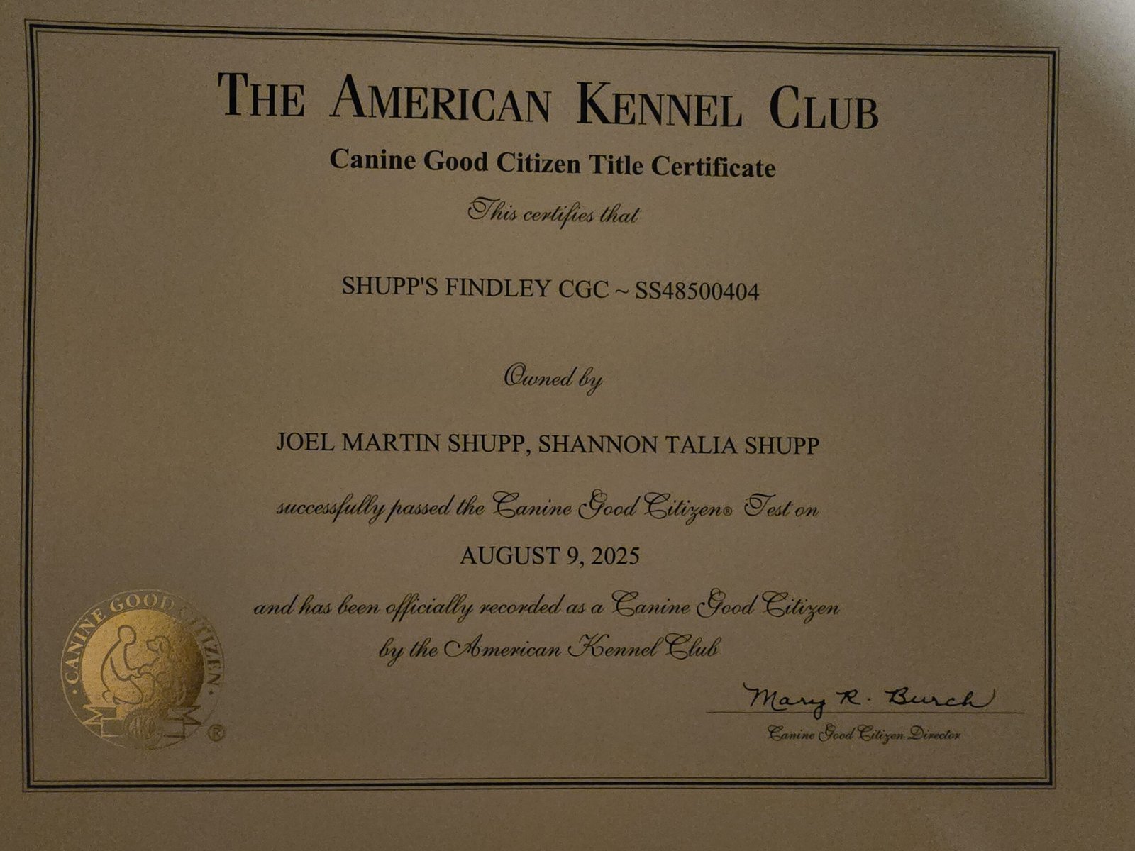 Chip completed his Canine Good Citizen Certification on 8/9/25 and is Therapy Dog certified as of 8/30/25. He has retired from our breeding program, and was adopted by one of our family members to continue carrying on the Shupp’s Paws of Valor mission. He is the sire of the “A-Team” litter of Maggie + Chip, 7/11/25.