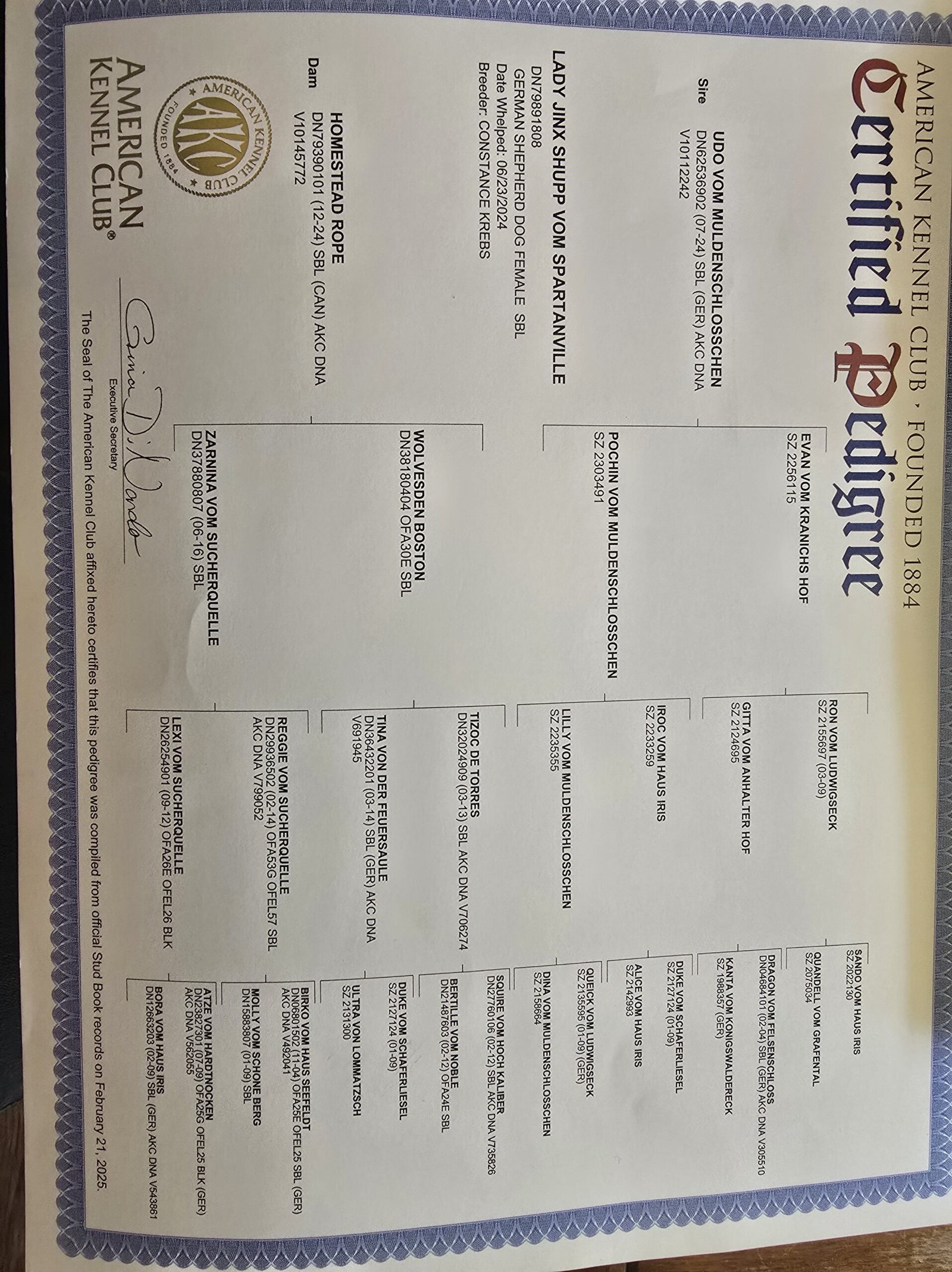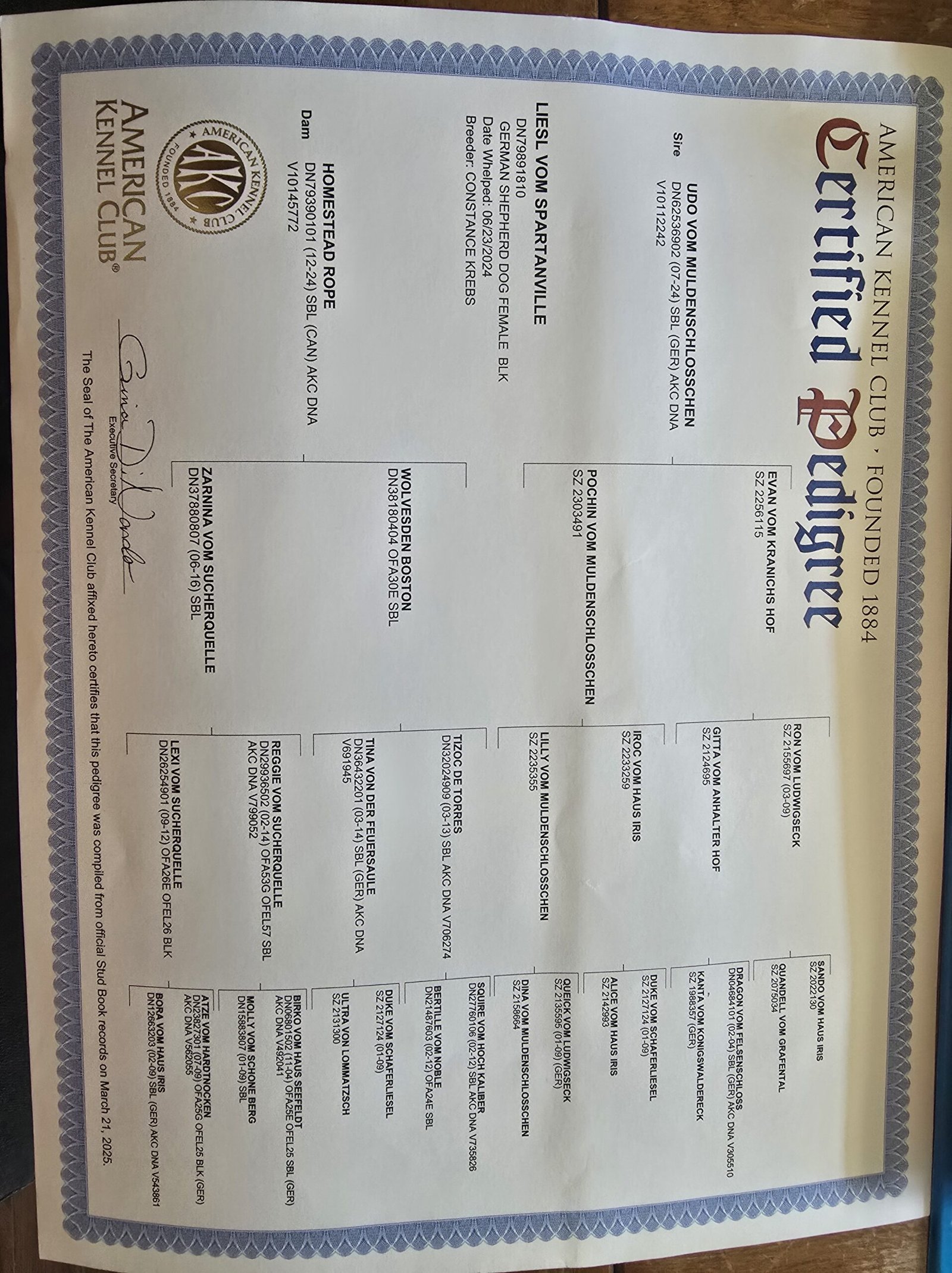 Introducing Liberty, our exceptional DDR (East German Working Line) German Shepherd. She embodies all the classic traits of the breed: intelligence, a calm demeanor, and unwavering loyalty. Liberty is a true companion with a high drive for work and an even greater love for a good snuggle. She’s wonderful with children and other pets, and we’re confident she will pass on her gentle, protective, and loving nature to her future pups.